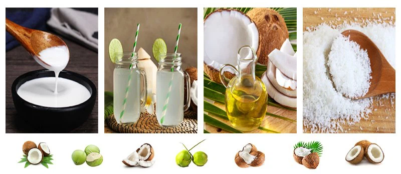SHJUMP производит машины и комплексные установки для переработки кокосового молока, кокосовых сливок и кокосовой воды. Мы проектируем, производим и поставляем комплексное оборудование для производства кокосового ореха, включая: - систему экстракции и фильтрации кокосовой воды - систему экстракции кокосового молока - систему экстракции кокосового масла - систему сушки кокосового порошка - систему сушки сушеных хлопьев.
